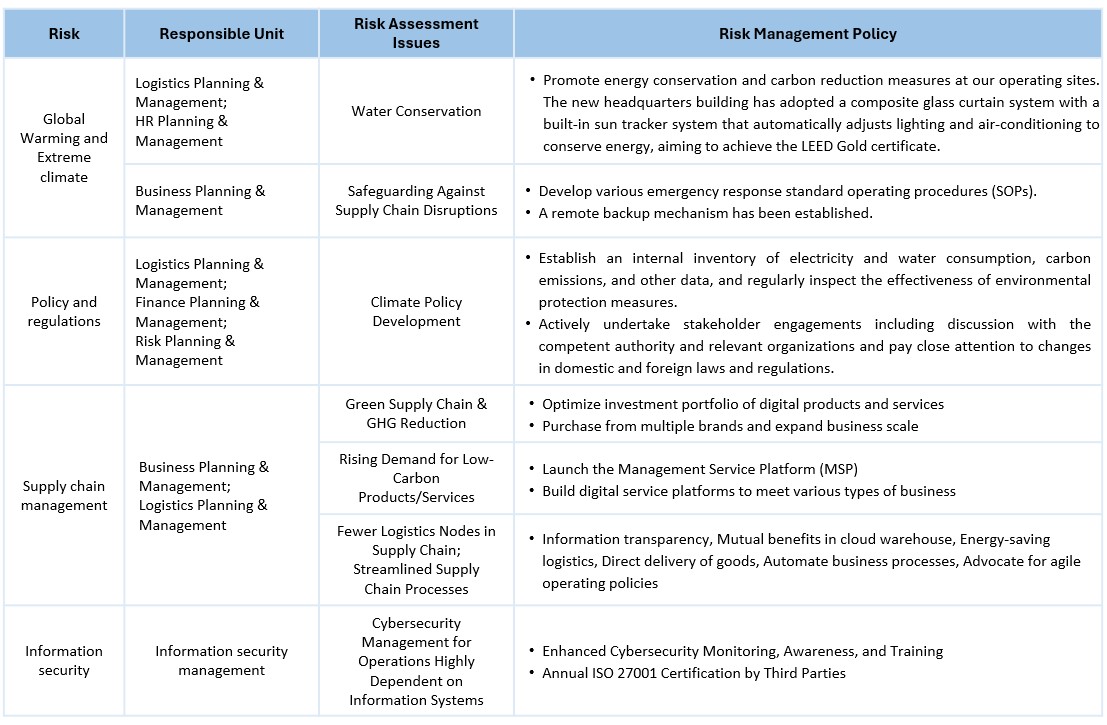 The boundary of the Company's risk assessment is Taiwan Synnex Technology International Corporation, including wholly owned subsidiary Synergy Intelligent Logistics Corp. Risk-related units in the organization were integrated into the Risk Management Team, and the president serves as the convener of the Risk Management Team. The team identifies and manages risk factors based on the materiality principle, and in accordance with environmental, social, or governance (ESG) issues related to the company's operations, and facilitates command and dispatch, assessment, and implementation of the risk management policy by the risk management organization, as described below: